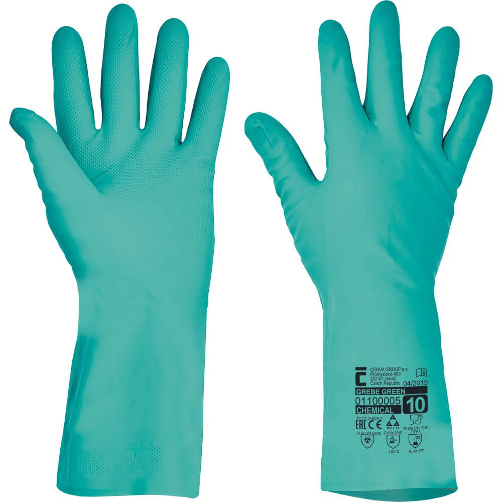 Rękawice GREBE GREEN nadają się do wielu branż, takich jak przemysł chemiczny, motoryzacyjny, rolnictwo, przemysł spożywczy oraz usługi porządkowe. To doskonały wybór dla pracowników mających kontakt z substancjami chemicznymi, smarami, olejami czy rozpuszczalnikami oraz dla osób wykonujących prace wymagające ochrony przed mikroorganizmami. Dopuszczone do kontaktu z żywnością - norma FOOD CONTACT.