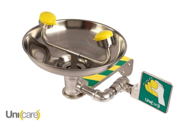 Oczomyjka szybka i łatwa do uruchomienia dzięki płytce naciskowej. Przepływ wody uruchamia się jednym prostym ruchem, co jest kluczowe w sytuacjach nagłych. Oczomyjka zapewnia przepływ wody odpowiedni do skutecznego i bezpiecznego płukania oczu. Montowana na ścianie, w miejscu dostępnym dla wszystkich pracowników w razie potrzeby. Wykonana ze stali nierdzewnej, która zapewnia długotrwałość urządzenia i odporność na korozję.