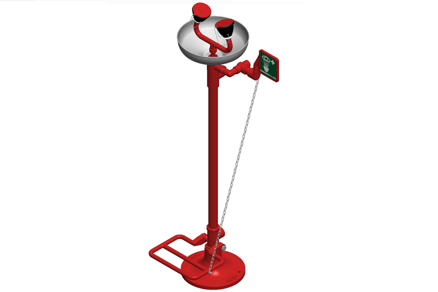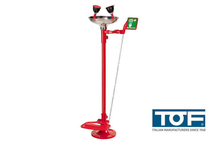 Oczomyjka z misą ze stali nierdzewnej na stojaku z dodatkową opcją uruchamiania nogą - model TOF 1100/330X - to urządzenie do ratunkowego płukania oczu po kontakcie z substancjami chemicznymi występującymi w miejscu pracy. Natychmiastowe płukanie oczu po wypadku zmniejsza stopień obrażeń, redukuje ryzyko powikłań i utraty wzroku.