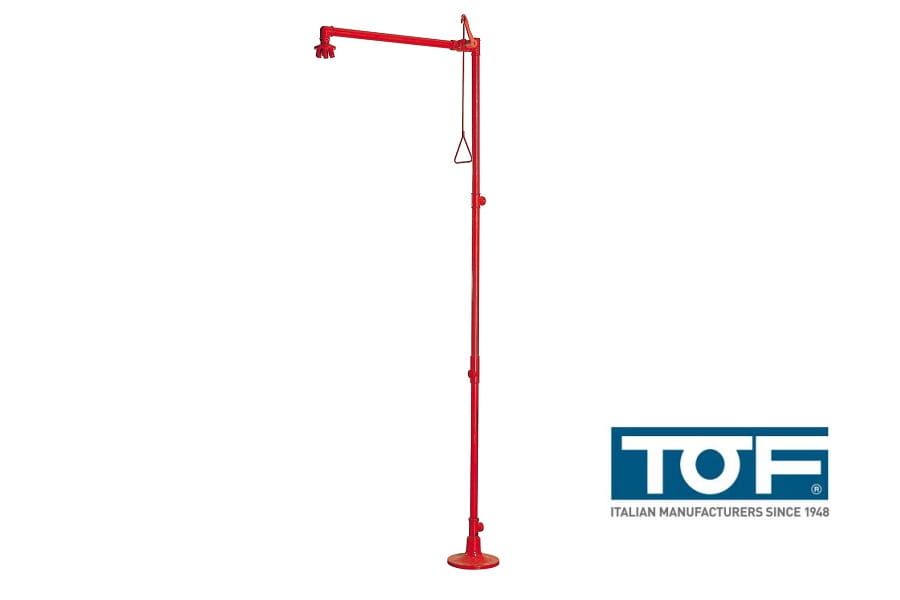 Prysznice bezpieczeństwa powinny być montowane w miejscach, gdzie występuje ryzyko kontaktu pracowników z niebezpiecznymi dla zdrowia substancjami chemicznymi. Model prysznica bezpieczeństwa TOF 1100/350 to stacjonarne urządzenie do użytku wewnętrznego. Prysznic montowany jest do podłogi. Wymaga podłączenia do źródła wody. Pociągnięcie wiszącej rączki uruchamia strumień wody w prysznicu.