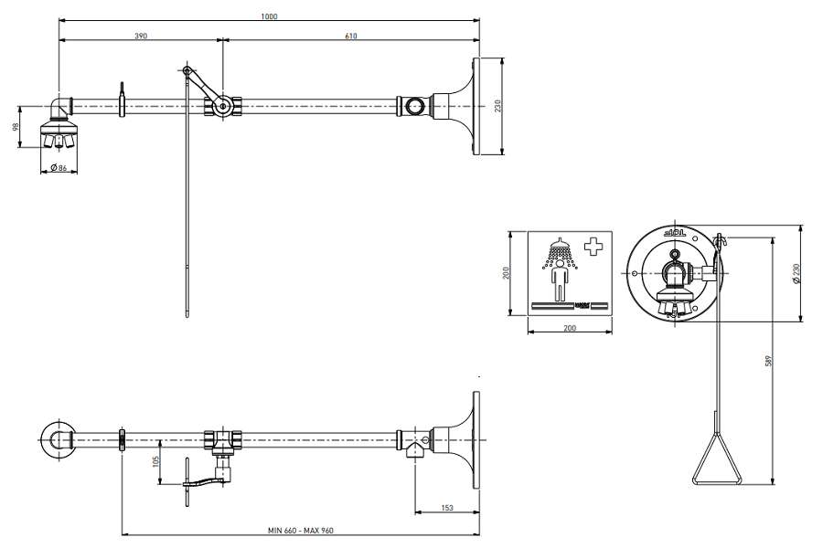 - prysznic ratunkowy stacjonarny do montażu do ściany,