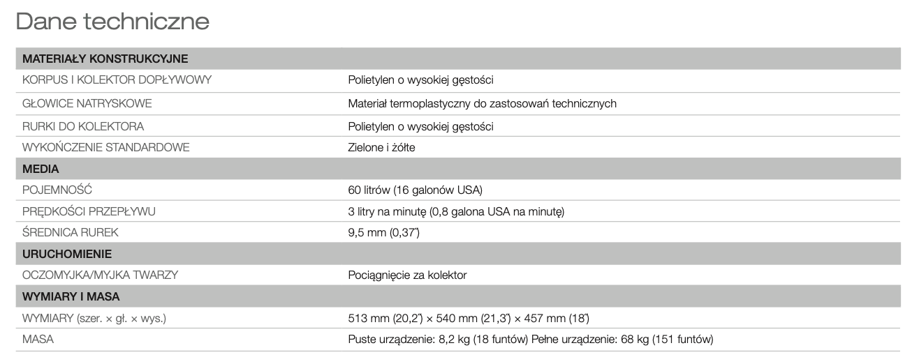 Stanowisko do przemywania oczu o pojemności 60 litrów dostarcza trzy litry wody pitnej na minutę przez 15 minut, zgodnie z normami europejskimi i międzynarodowymi (ANSI i EN). Nadaje się do użytku w pomieszczeniach, a po dodaniu opcjonalnej ogrzewanej obudowy może być również instalowane na zewnątrz pomieszczeń.