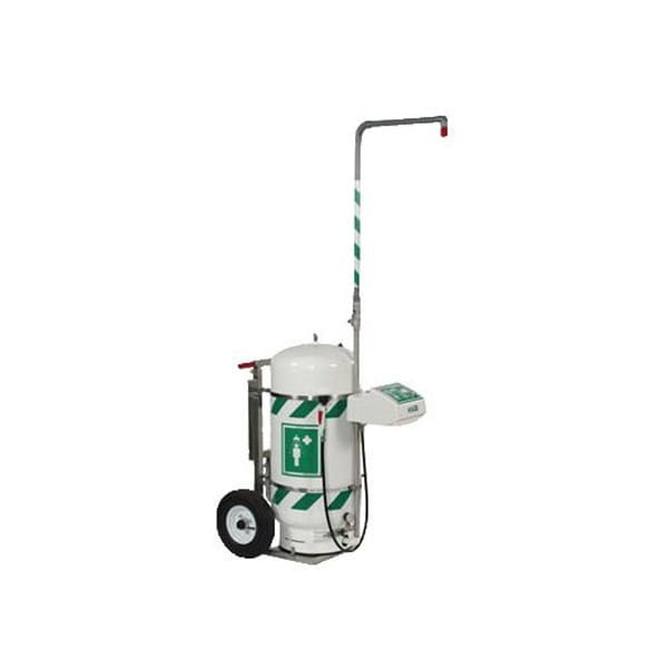 Mobilny natrysk ratunkowy przeznaczony do tymczasowego użytku – zbiornik zapewnia spłukiwanie wodą z prysznica ratunkowego przez 1,5 minuty.