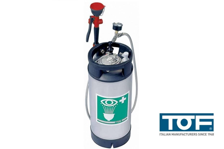Prysznic bezpieczeństwa przenośny TOF 1100/250 to urządzenie do awaryjnego płukania oczu i ciała po kontakcie z substancjami chemicznymi występującymi w miejscu pracy. Przeznaczony do użytku tam, gdzie nie ma możliwości podłączenia prysznica stacjonarnego. Prysznic przenośny można zabrać na każde stanowisko pracy. Natychmiastowe płukanie oczu, twarzy i innych części ciała zmniejsza stopień obrażeń i redukuje ryzyko późniejszych powikłań. Prysznice i oczomyjki ratunkowe powinny zabezpieczań miejsca pracy, w których występuje ryzyko kontaktu pracowników z różnego rodzaju substancjami niebezpiecznymi. Model TOF 1100/250 to przenośny prysznic działający niezależnie od źródeł wody. Uruchomienie prysznica następuje przez naciśnięcie rączki na końcu węża, co otwiera strumień wody. Puszczenia rączki i jej powrót do pozycji wyjściowej zamyka strumień wody.